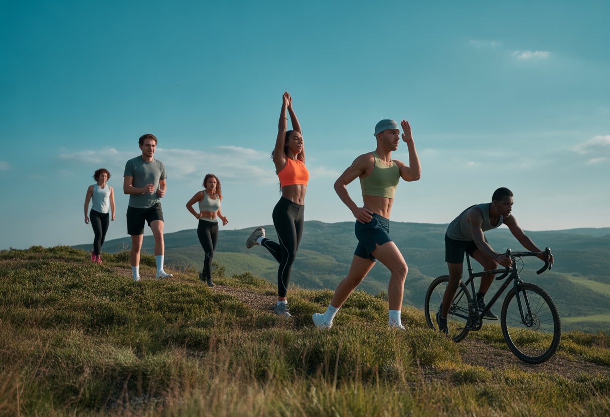A group of athletes running, cycling, and hiking on trails in green hills under a clear blue sky.